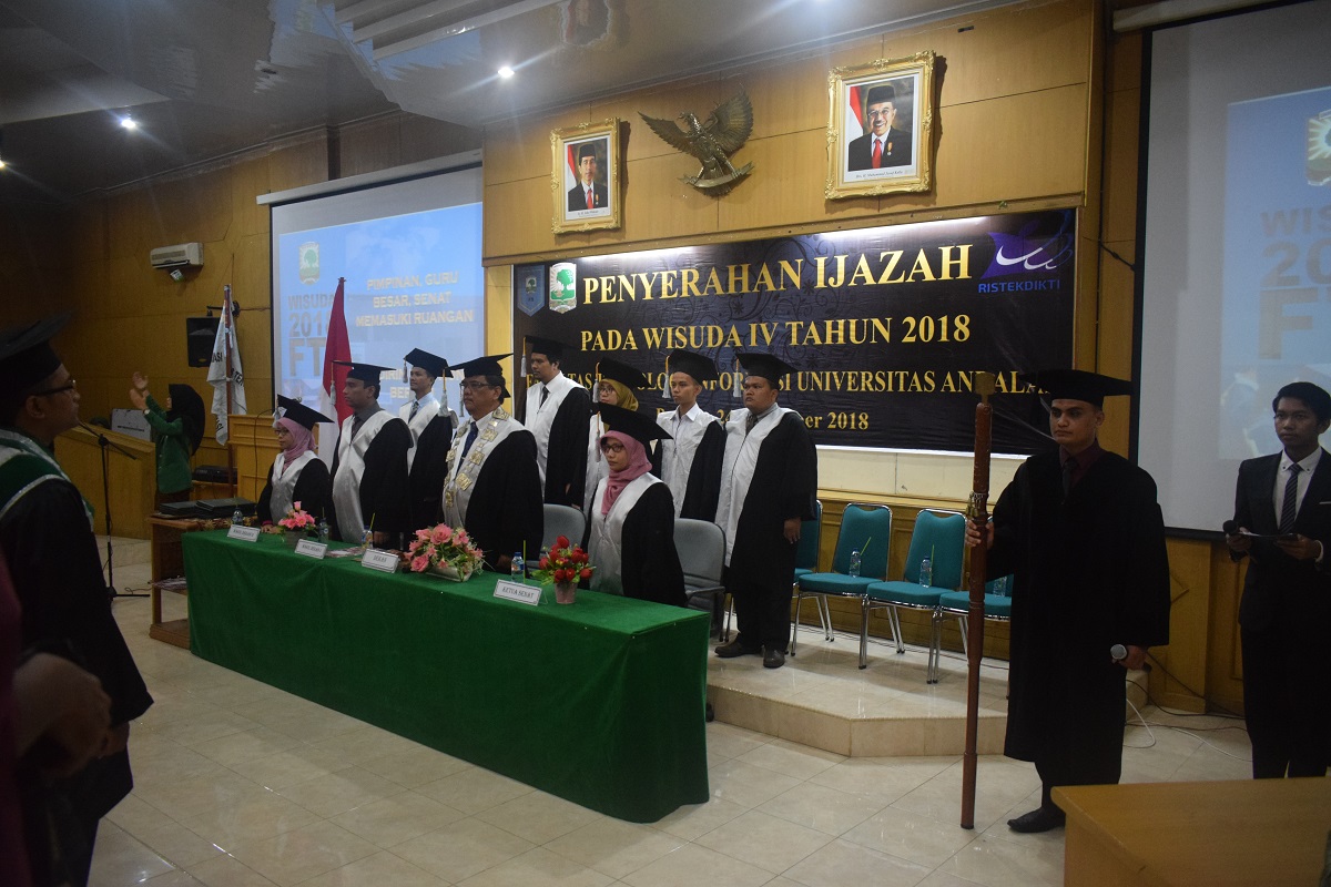 Fakultas Teknologi Informasi mewisuda sebanyak 14 lulusan baru pada wisuda periode IV tahun 2018 ini. Seperti acara sebelum-sebelumnya, acara penyerahan ijaza pada wisuda IV tahun 2018 ini dilaksanakan di ruang seminar gadung F Universitas Andalas pada hari sabtu tanggal 24 november 2018 dimulai pada pukul 10.30 WIB dan berakhir pada Pukul 12.30 WIB.