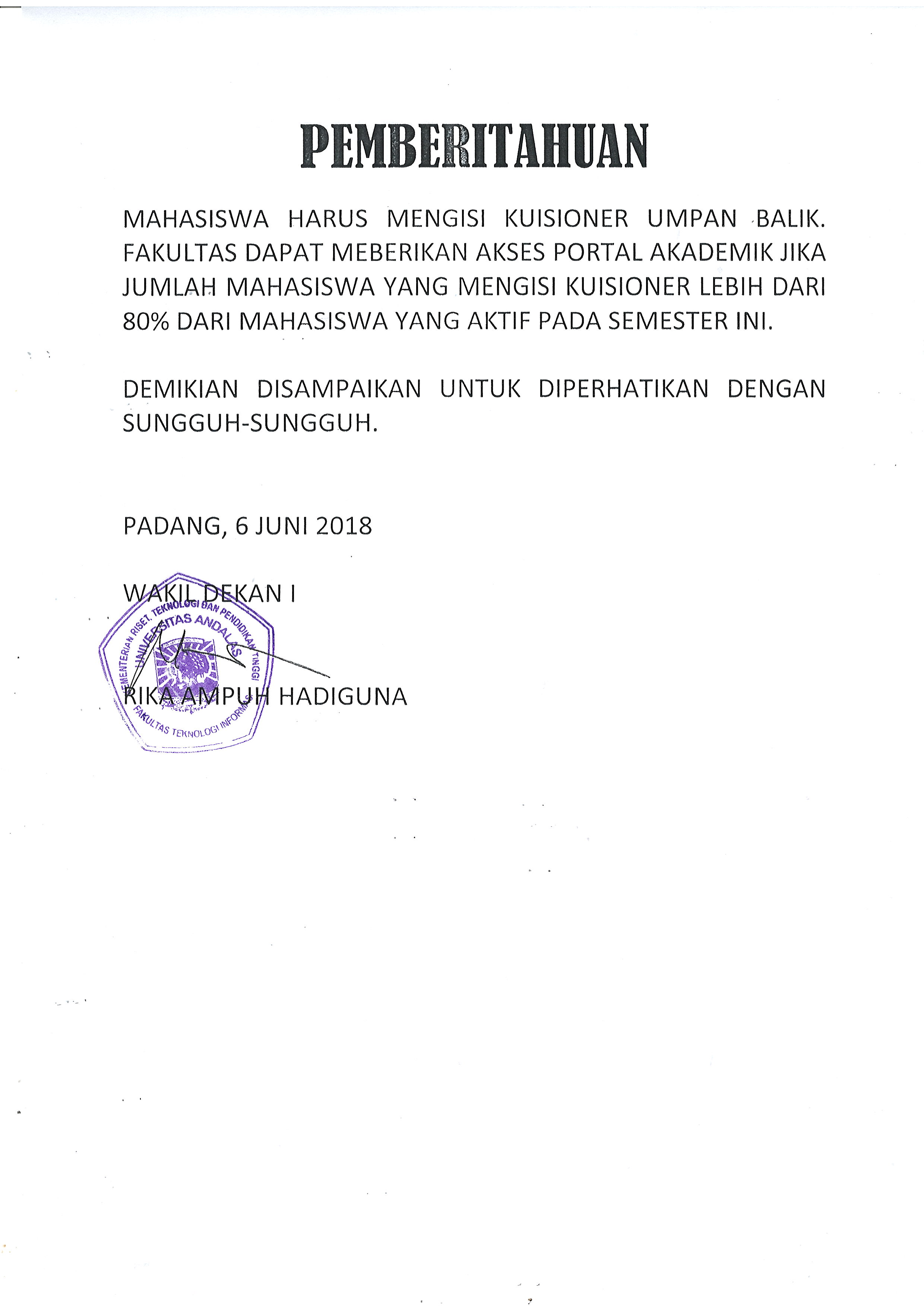 Fakultas Teknologi Informasi Universitas Andalas menerima sebayak 65 mahasiswa baru dari jalur Seleksi Bersama Masuk Perguruan Tinggi Negeri (SBMPTN) pada hari kamis tanggal 12 Juli 2018.