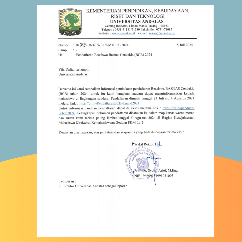 Bank Indonesia kembali akan memberikan beasiswa kepada mahasiswa Universitas Andalas Tahun 2024. Kriteria umum mahasiswa penerima beasiswa sebagai berikut: