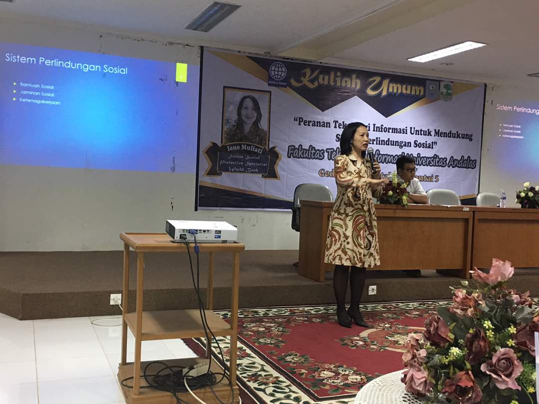 Fakultas Teknologi Informasi (FTI) Unand kembali mengadakan Kuliah Umum pada tanggal 21 April 2017, dari jam 09.00 – 11.30, bertempat di Gedung Perpustakaan Lantai 5. Nara sumber kali ini adalah Iene Muliati, Senior Social Protection Specialist World Bank. Tema yang diberikan kali ini adalah: Peran Teknologi Informasi dalam Mendukung Sistem Perlindungan Sosial.