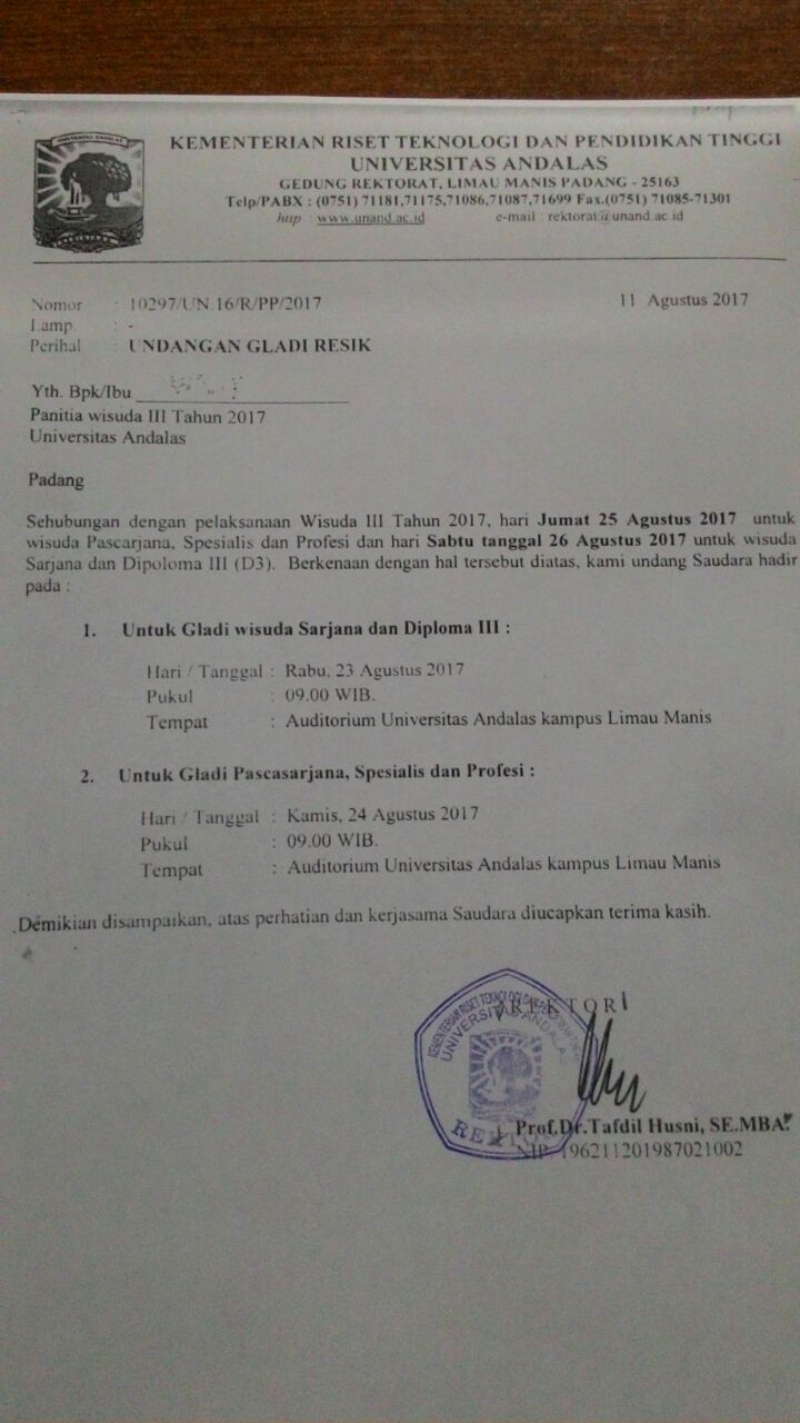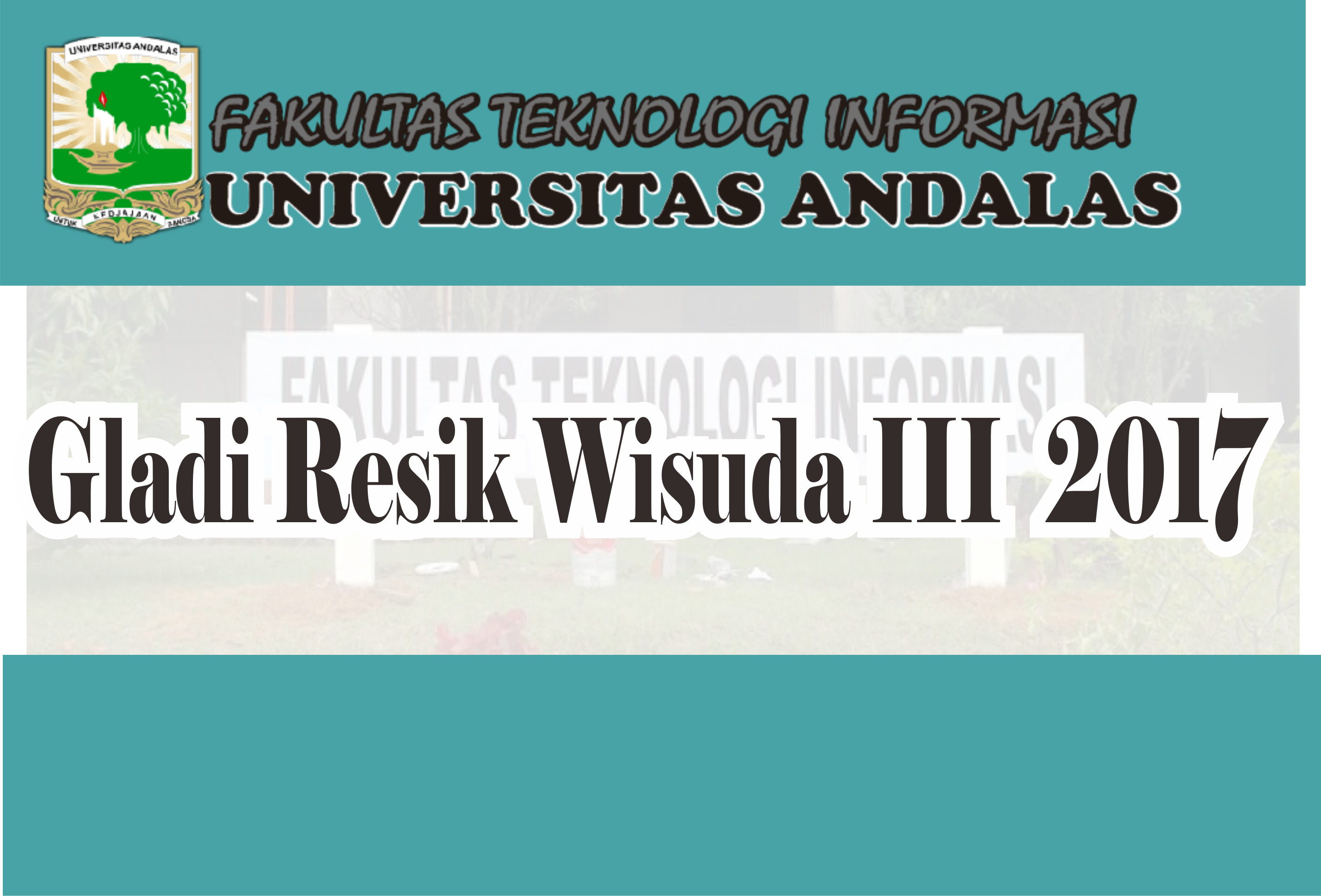 Diberitahukan kepada mahasiswa Fakultas Teknologi Informasi, Bahwa Gladi Resik untuk Wisuda III tahun 2017 diadakan pada hari rabu tanggal 23 agustus 2017 di Auditorium Universitas Andalas seperti Lampiran Berikut ini :