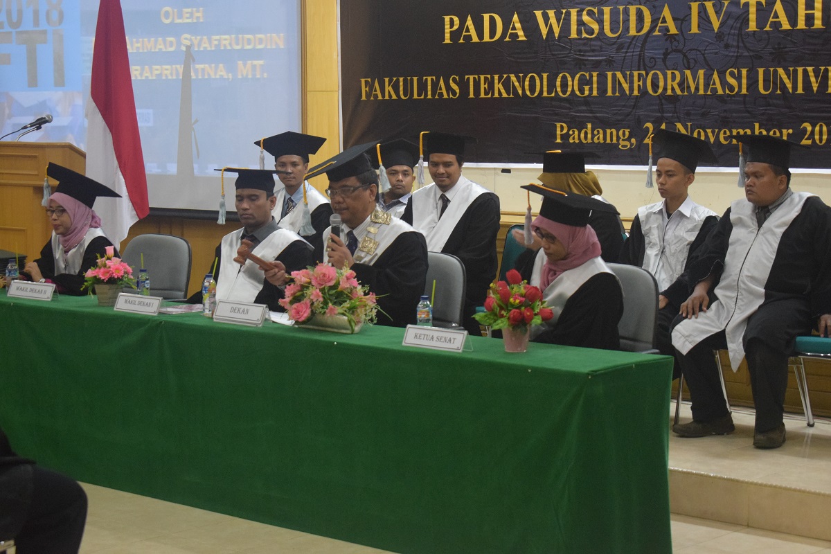 Fakultas Teknologi Informasi mewisuda sebanyak 14 lulusan baru pada wisuda periode IV tahun 2018 ini. Seperti acara sebelum-sebelumnya, acara penyerahan ijaza pada wisuda IV tahun 2018 ini dilaksanakan di ruang seminar gadung F Universitas Andalas pada hari sabtu tanggal 24 november 2018 dimulai pada pukul 10.30 WIB dan berakhir pada Pukul 12.30 WIB.