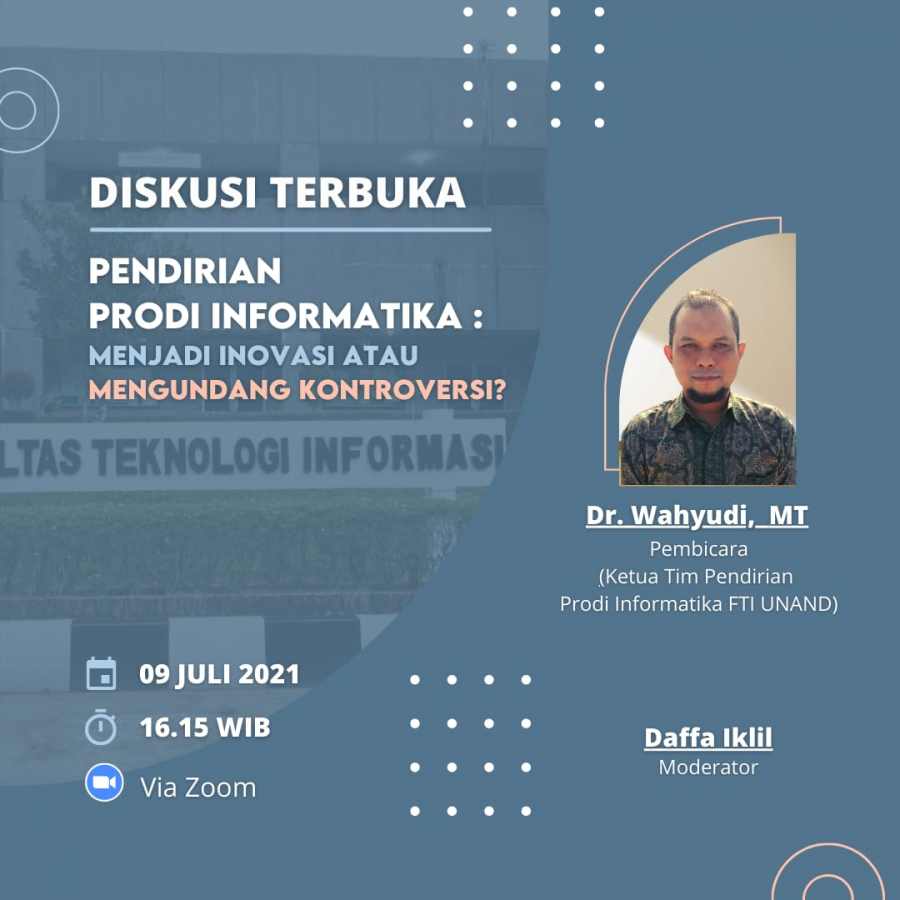 Padang – Bem KM FTI mengadakan acara Webinar pada tanggal 9 Juli 2021 secara daring melalui aplikasi Zoom Meeting dengan tema “Diskusi Terbuka : Pendirian Prodi Informatika menjadi Inovasi atau Mengundang Kontroversi” yang menghadirkan Ketua TIM Pendirian Prodi Informatika FTI Unand Dr. Wahyudi, MT sebagai narasumbernya.