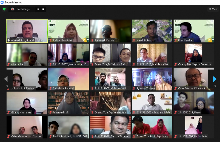 Padang (FTI-UNAND) Sabtu (4/9) melaksanakan acara pertemuan antara pimpinan dan dosen FTI dengan orang tua mahasiswa angkatan 2021. Acara ini dimulai Pukul 13.40 s/d 16.00 WIB yang digelar secara daring via Aplikasi Zoom Meeting mengingat kondisi pandemi saat ini. Pertemuan ini adalah pertemuan rutin tiap tahun yang dilaksanakan oleh Fakultas Teknologi Informasi Universitas Andalas yang bertujuan untuk memberikan informasi dan sistem belajar di Fakultas Teknologi Informasi dan jurusan serta untuk menjalin silaturahmi antara pimpinan fakultas, jurusan, dosen, tendik, orang tua dan mahasiswa.