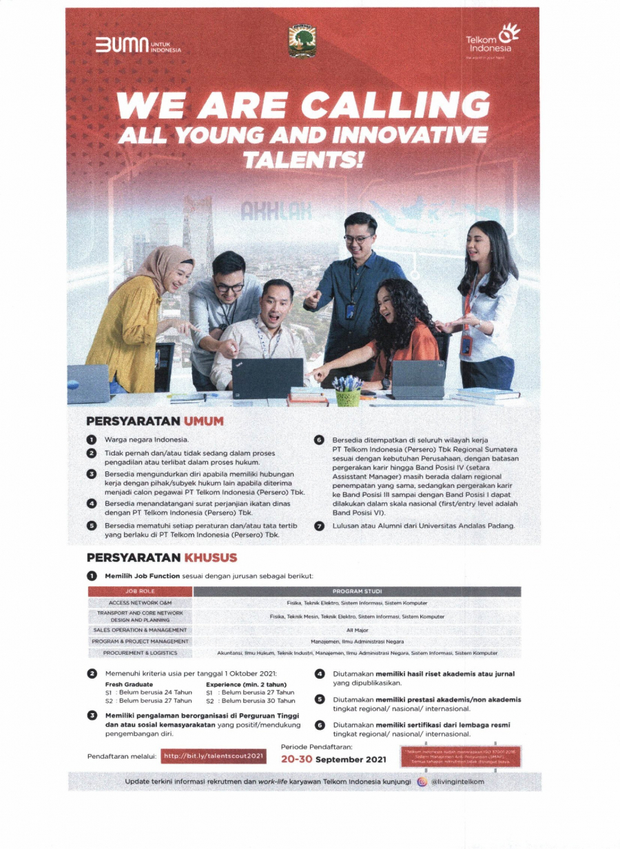 Diberitahukan Kepada Alumni Fakultas Teknologi Informasi Universitas Andalas, yang berminat mengikuti Seleksi Calon Karyawan PT Telkom Indonesia (Persero) silahkan melakukan pendaftaran melalui http://bit.ly/talentscout2021.