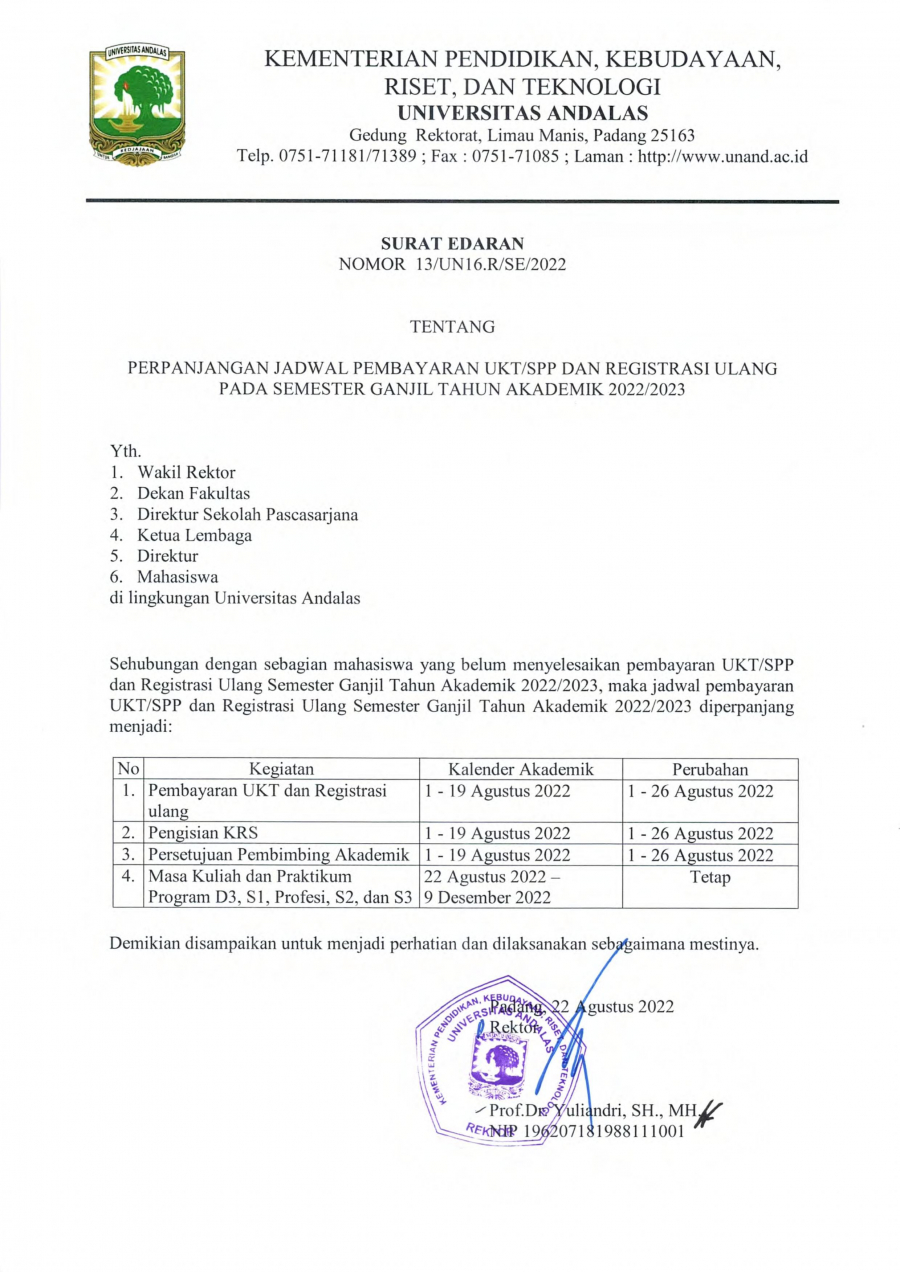 Perpanjangan Jadwal Pembayaran UKT/SPP dan Registrasi Ulang Pada Semester Ganjil Tahun Akademik 2022/2023