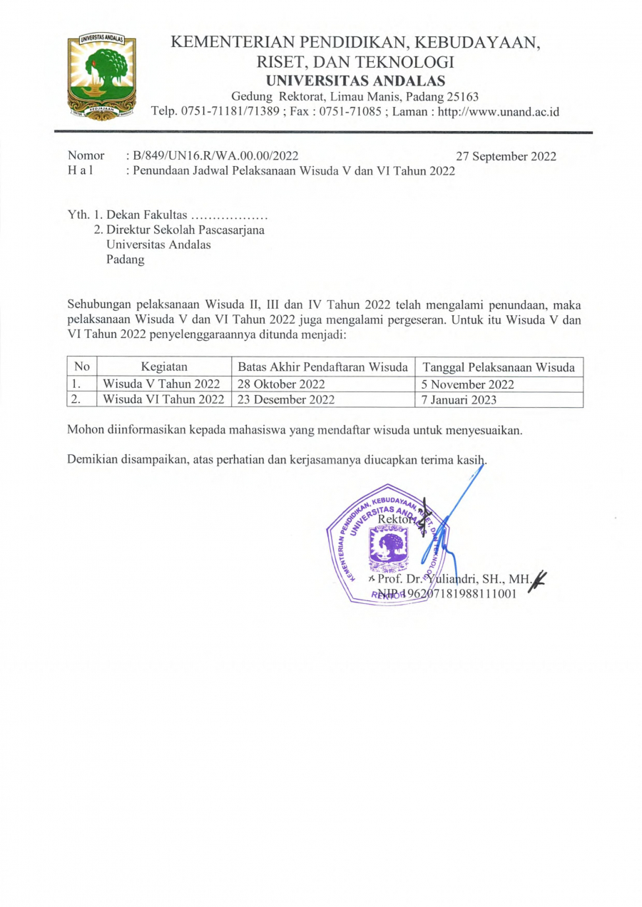 Penundaan Jadwal Pelaksanaan Wisuda V dan VI Tahun 2022