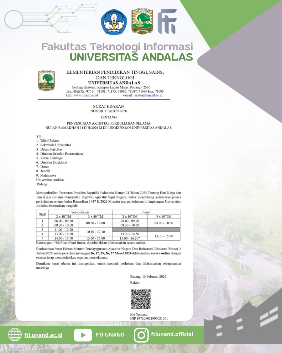 Edaran penyesuaian aktifitas perkuliahan selama bulan Ramadhan 1447 H/2026 M
