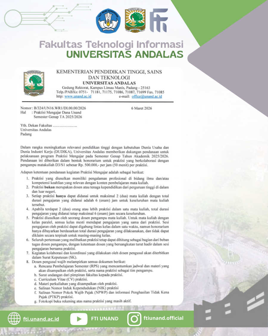 Dalam rangka meningkatkan kualitas pembelajaran dan memperkuat keterkaitan antara dunia akademik dengan dunia usaha dan dunia industri, Universitas Andalas membuka Program Praktisi Mengajar dengan Pendanaan Universitas Andalas untuk Semester Genap Tahun Akademik 2025/2026.