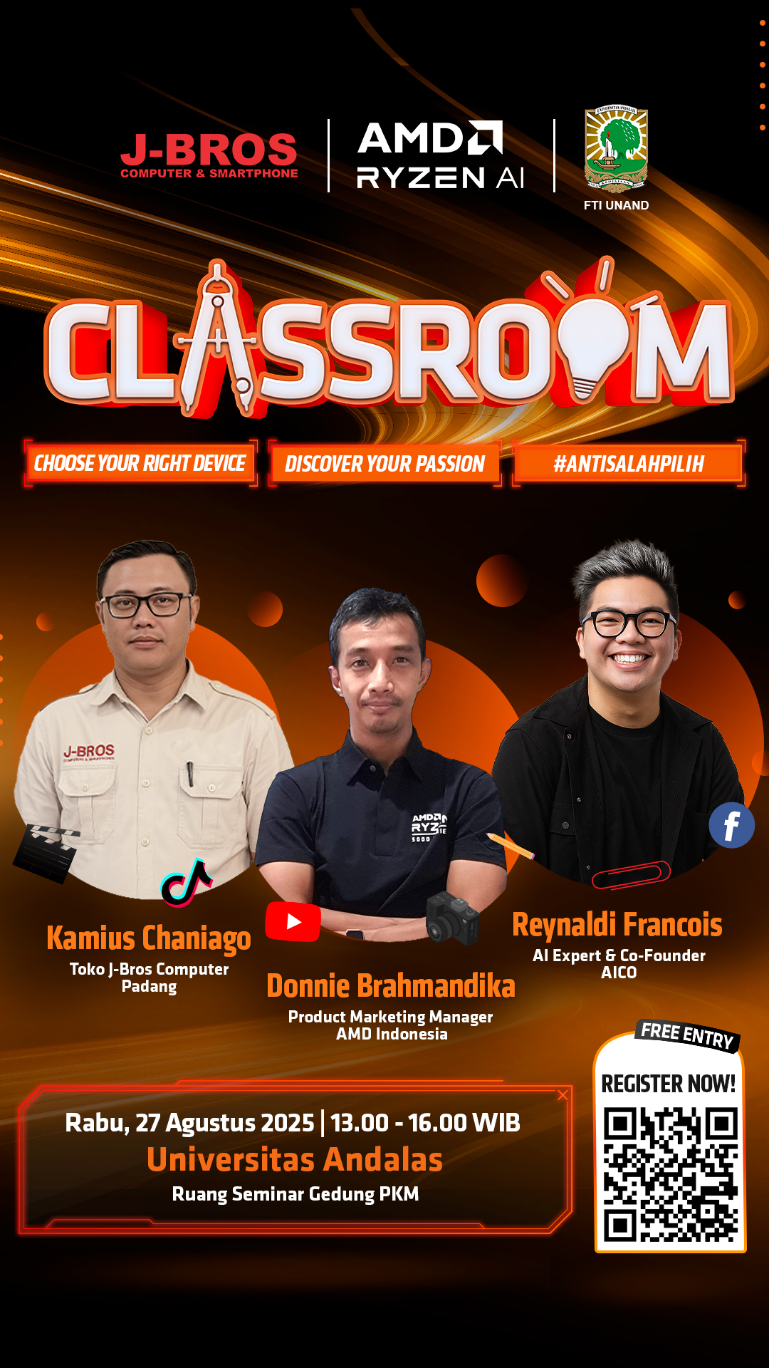 Fakultas Teknologi Informasi Universitas Andalas bekerja sama dengan J-Bros Computer & Smartphone dan AMD Indonesia akan mengadakan kegiatan CLASSROOM dengan tema: